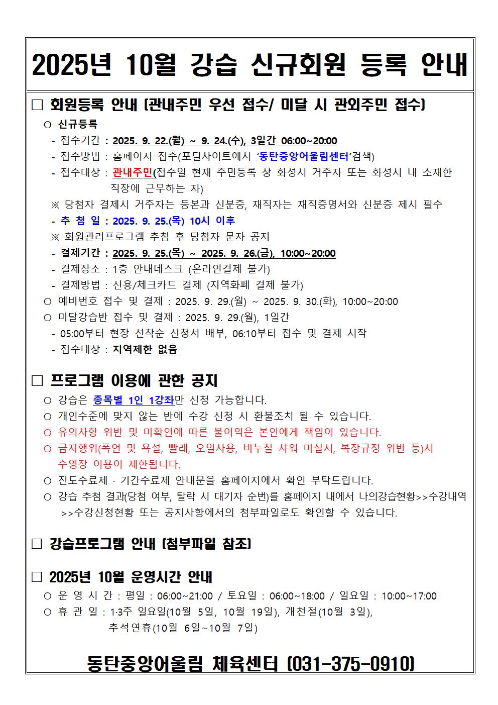 동탄중앙어울림센터 2025년 10월 정규강습 신규회원 모집 안내