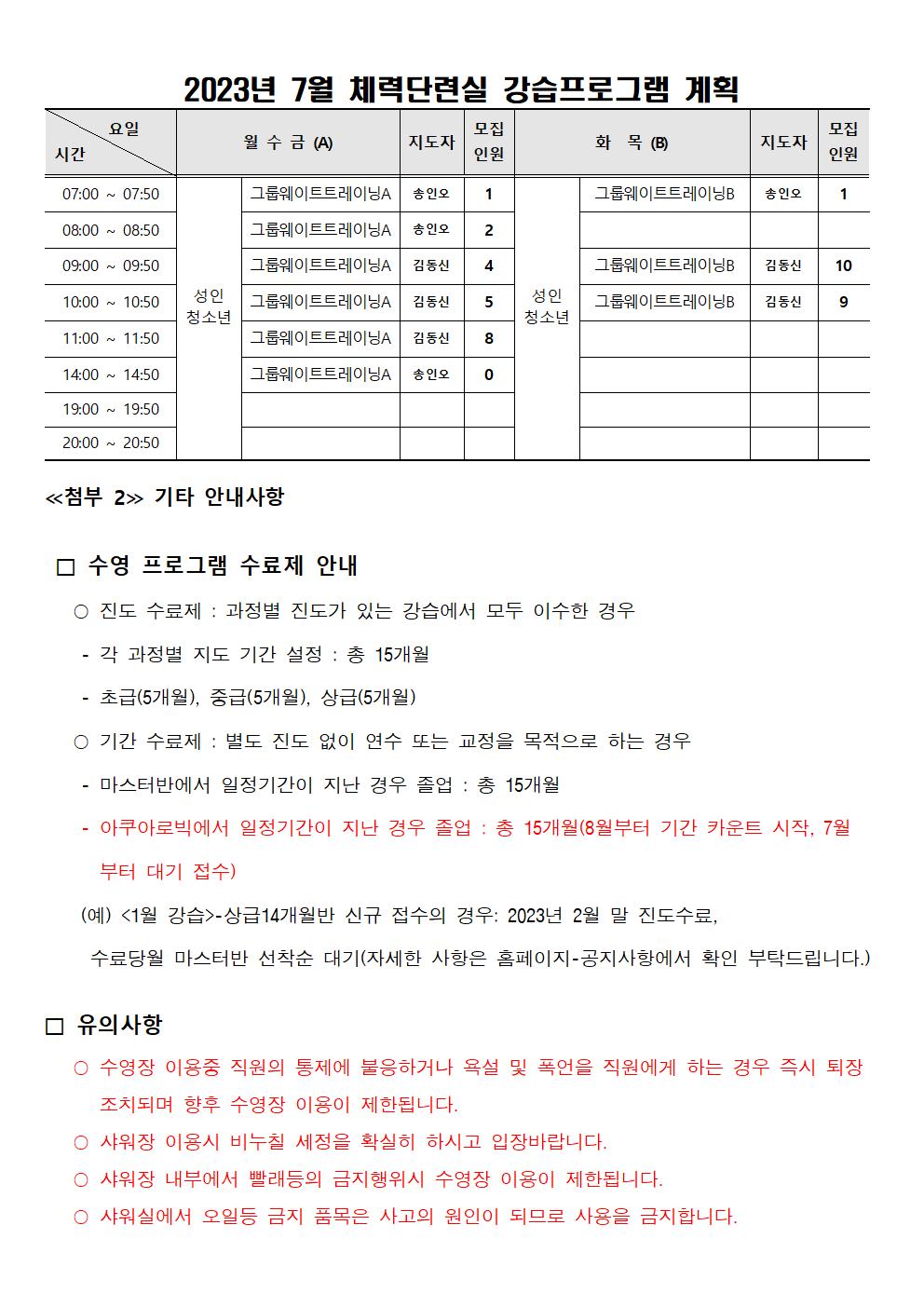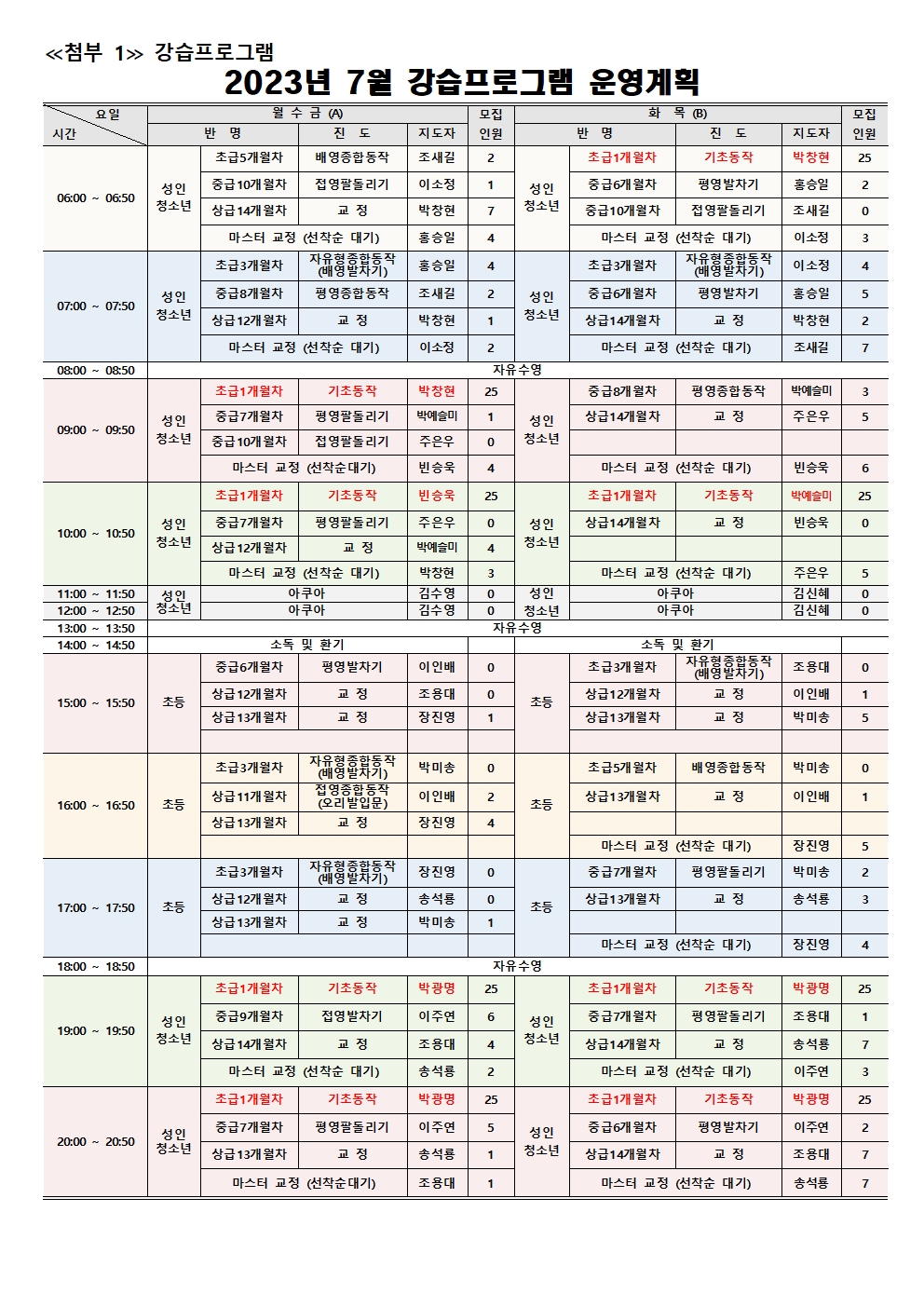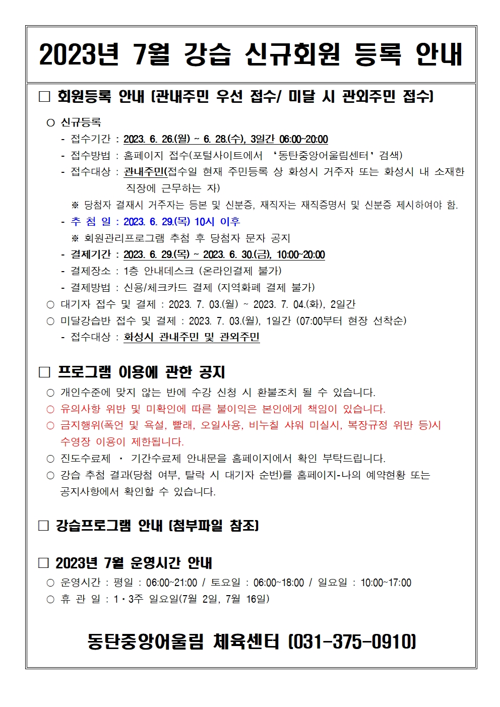 동탄중앙어울림센터 2023년 7월 정규강습 신규회원 모집 안내 작성자 관리자 작성일 2023년 6월 23일 11시 24분 13초 조회 4,303 image001.jpg [ Size : 661.34KB, Down : 8,195 ] 미리보기 다운로드 image002.jpg [ Size : 839.44KB, Down : 8,670 ] 미리보기 다운로드 2023년 7월 강습 신규회원 등록 안내문001.jpg [ Size : 168.62KB, Down : 4,979 ] 미리보기 다운로드 *1인1강좌만 신청가능 목록보기