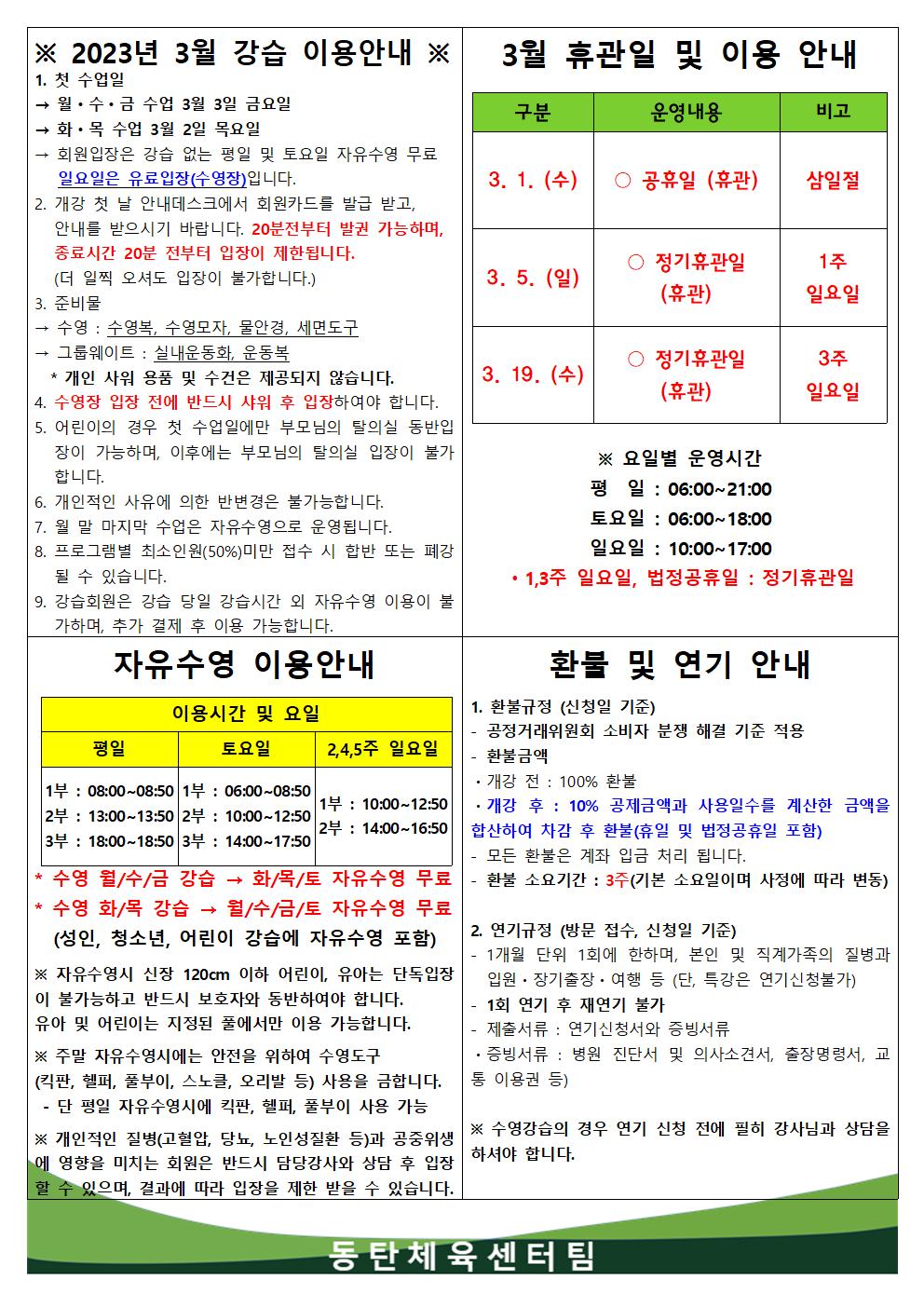동탄중앙어울림센터 2023년 3월 휴관일 및 이용안내 작성자 관리자 작성일 2023년 3월 7일 17시 14분 16초 조회 1,288 2023년 3월 강습이용안내001.jpg [ Size : 283.36KB, Down : 1,589 ] 미리보기 다운로드 목록보기