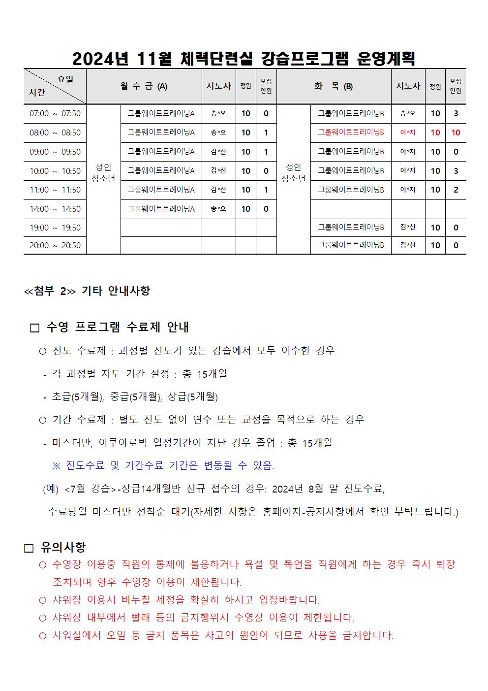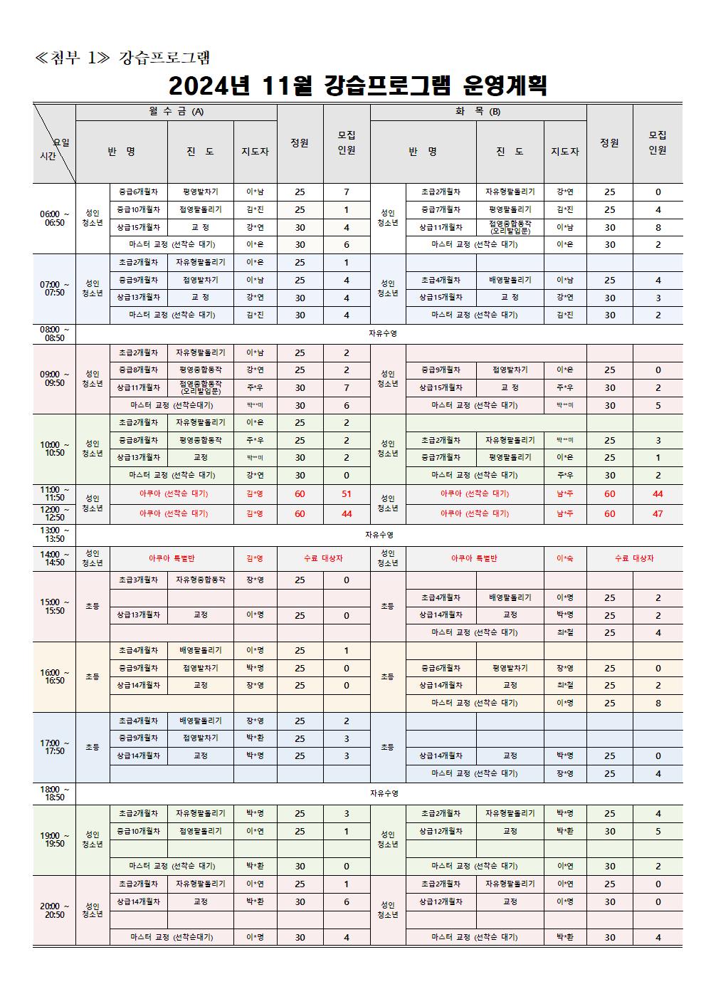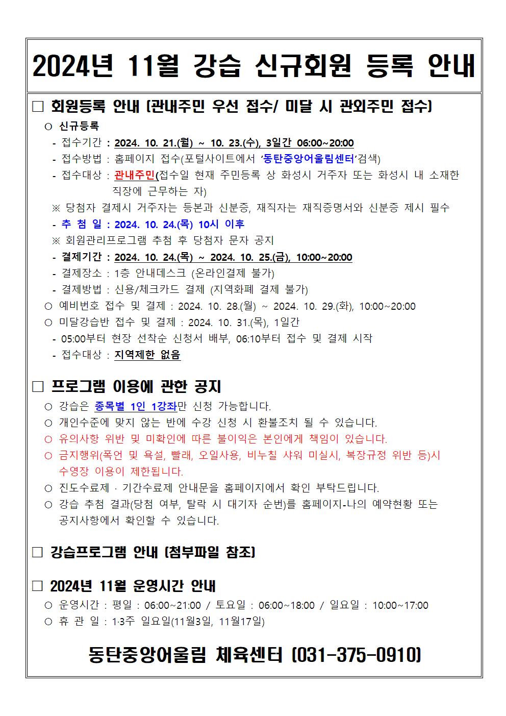 동탄중앙어울림센터 2024년 11월 정규강습 신규회원 모집 안내