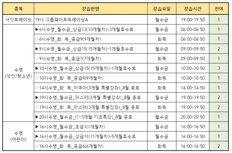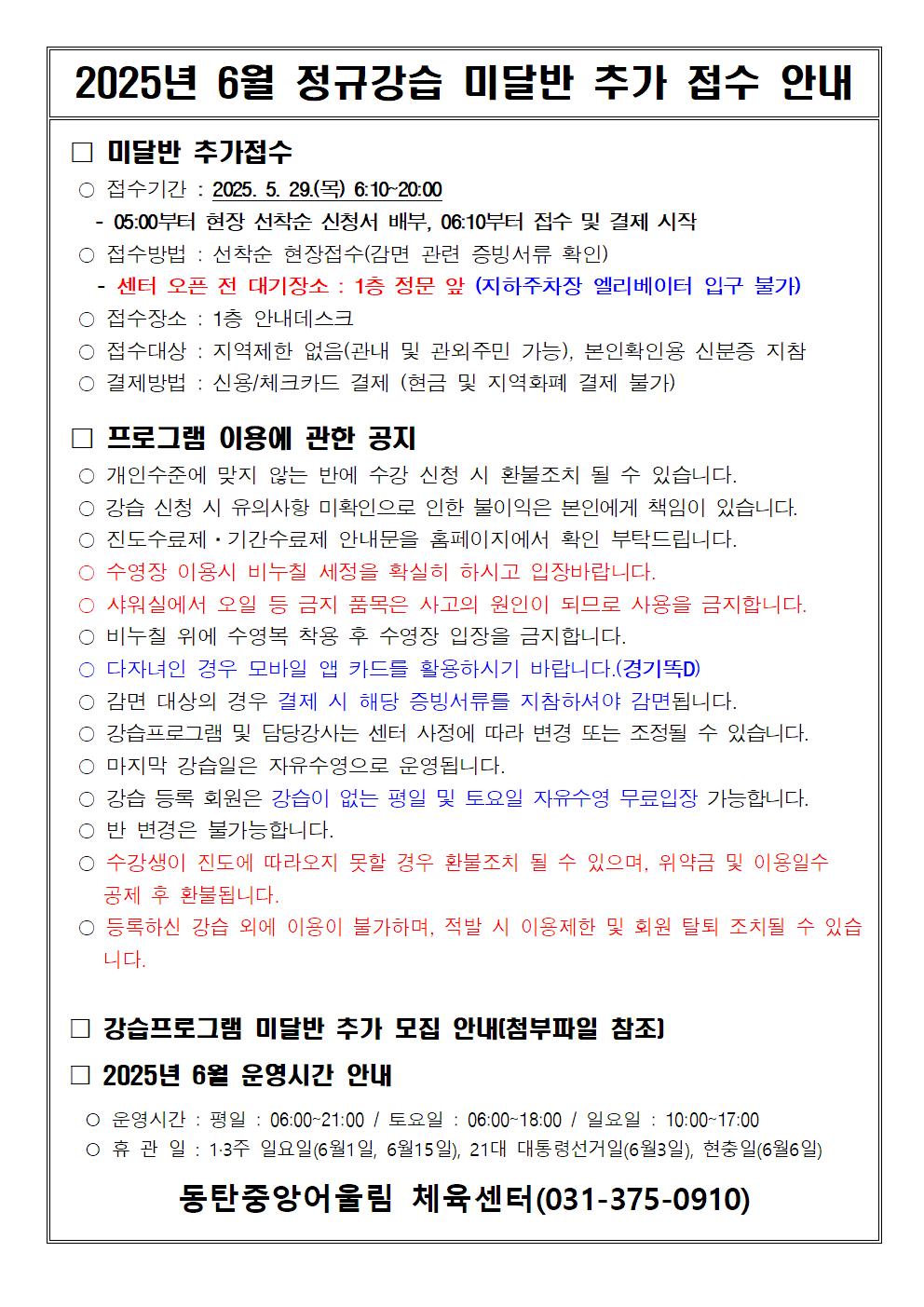 동탄중앙어울림센터 2025년 6월 정규강습 미달반 추가 모집안내 작성자 관리자 작성일 2025년 5월 28일 14시 1분 48초 조회 2,261 2025년 6월 정규강습 미달반 현황.jpg [ Size : 137KB, Down : 3,179 ] 미리보기 다운로드 2025년 6월 정규강습 미달반 추가 접수 안내.jpg [ Size : 226.92KB, Down : 2,923 ] 미리보기 다운로드 자세한 사항은 아래 공고문 확인바랍니다. 목록보기
