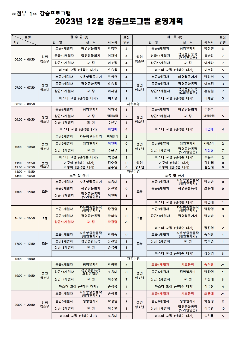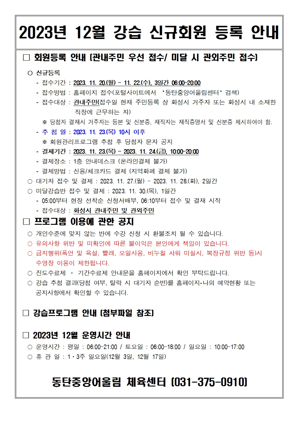 동탄중앙어울림센터 2023년 12월 동탄중앙어울림센터 정규강습 신규회원 모집 안내 작성자 관리자 작성일 2023년 11월 17일 9시 23분 47초 조회 3,536 image001.jpg [ Size : 680.24KB, Down : 2,195 ] 미리보기 다운로드 image002.jpg [ Size : 875.25KB, Down : 2,255 ] 미리보기 다운로드 image003.jpg [ Size : 555.16KB, Down : 2,111 ] 미리보기 다운로드 2023년 12월 강습 신규회원 등록 안내문.pdf [ Size : 120.64KB, Down : 430 ] 다운로드 목록보기