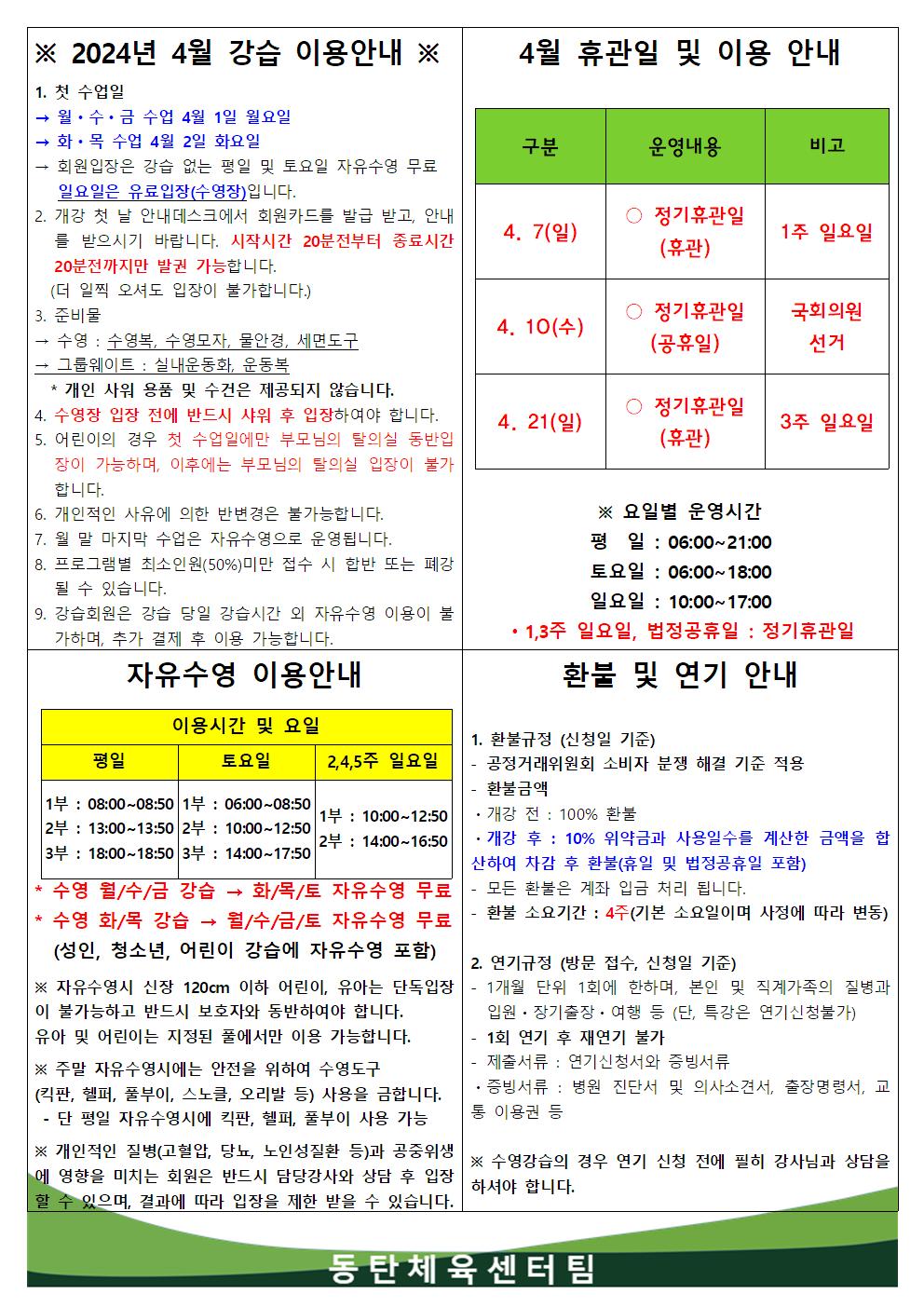 동탄중앙어울림센터 2024년 4월 휴관일 및 이용안내 작성자 관리자 작성일 2024년 3월 25일 14시 52분 23초 조회 1,196 2024년 4월 강습이용안내001.jpg [ Size : 284.27KB, Down : 1,238 ] 미리보기 다운로드 목록보기