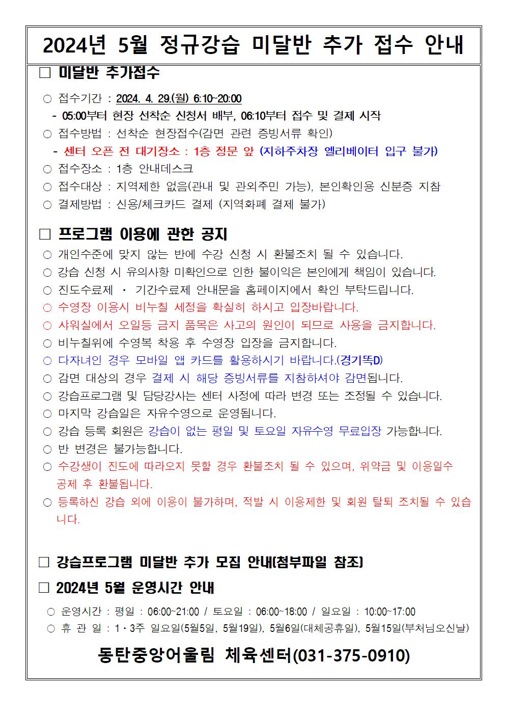 동탄중앙어울림센터 2024년 5월 정규강습 미달반 추가 모집안내