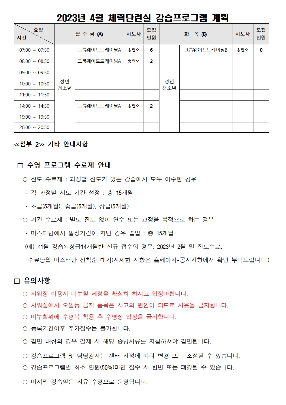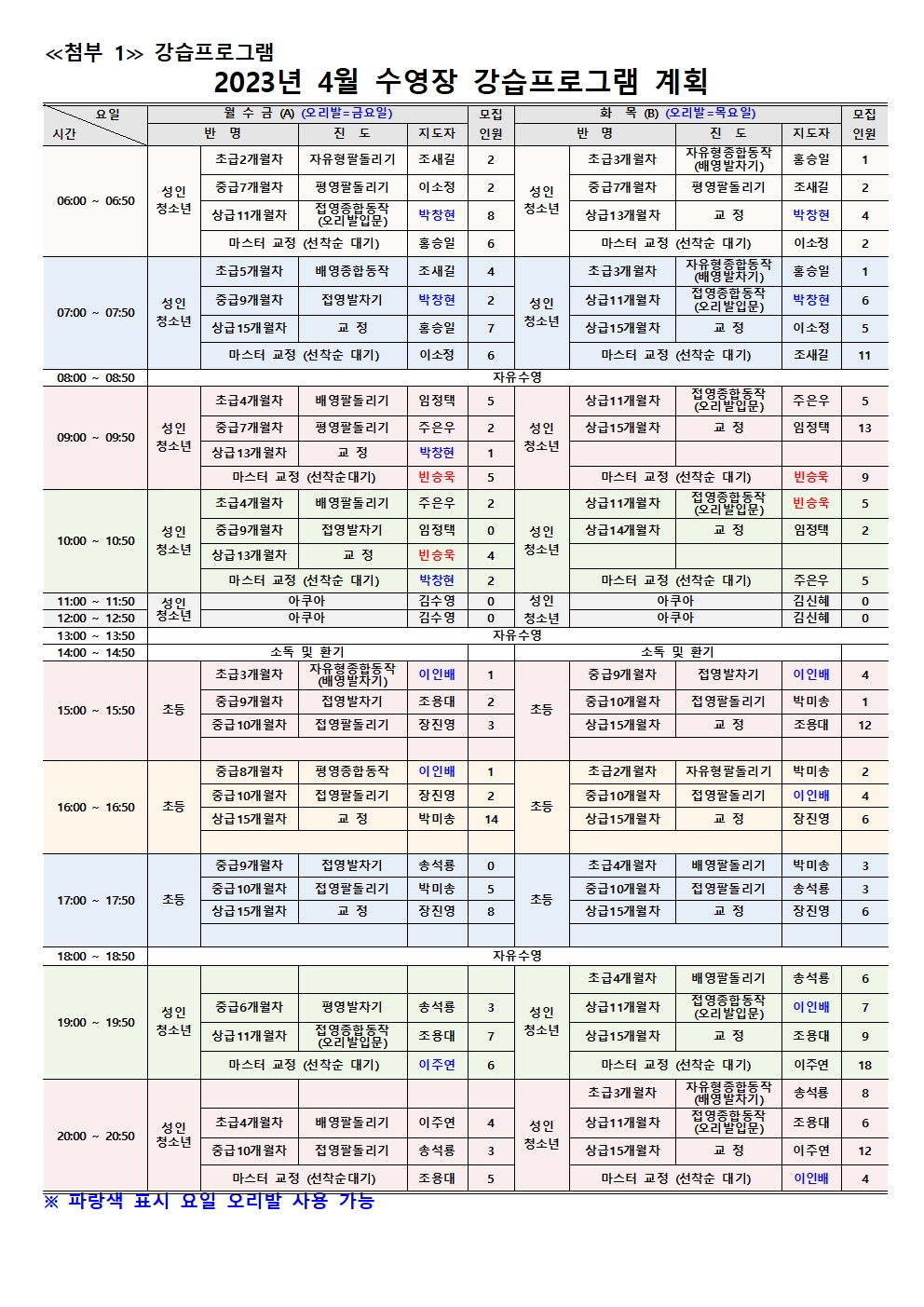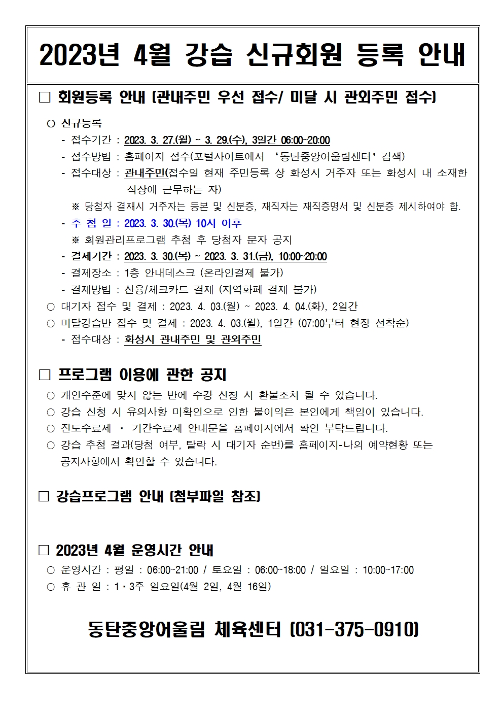 동탄중앙어울림센터 2023년 4월 정규강습 신규 모집 안내 작성자 관리자 작성일 2023년 3월 24일 13시 31분 1초 조회 3,304 신규 모집001.jpg [ Size : 625.09KB, Down : 5,705 ] 미리보기 다운로드 신규 모집002.jpg [ Size : 869.64KB, Down : 5,867 ] 미리보기 다운로드 신규 모집003.jpg [ Size : 517.96KB, Down : 5,433 ] 미리보기 다운로드 2023년 4월 신규 모집 인원.xlsx [ Size : 13.64KB, Down : 1,112 ] 다운로드 2023년 4월 강습 신규회원 등록 안내문.hwp [ Size : 92KB, Down : 752 ] 다운로드 목록보기