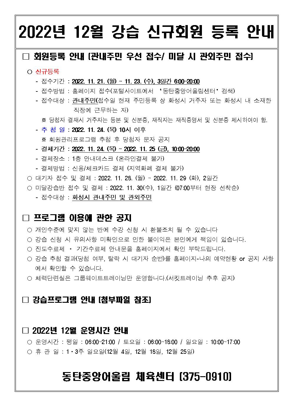 동탄중앙어울림센터 2022년 12월 정규강습 신규회원 모집 안내 작성자 관리자 작성일 2022년 11월 18일 14시 37분 11초 조회 2,680 2022년 12월 강습 신규회원 등록 안내문002.jpg [ Size : 288.43KB, Down : 5,055 ] 미리보기 다운로드 2022년 12월 강습 신규회원 등록 안내문.pdf [ Size : 113.86KB, Down : 809 ] 다운로드 2022년 12월 강습 신규회원 등록 안내문001.jpg [ Size : 205.5KB, Down : 4,464 ] 미리보기 다운로드 2022년 12월 강습 신규회원 등록 안내문003.jpg [ Size : 165.45KB, Down : 371 ] 미리보기 다운로드 목록보기