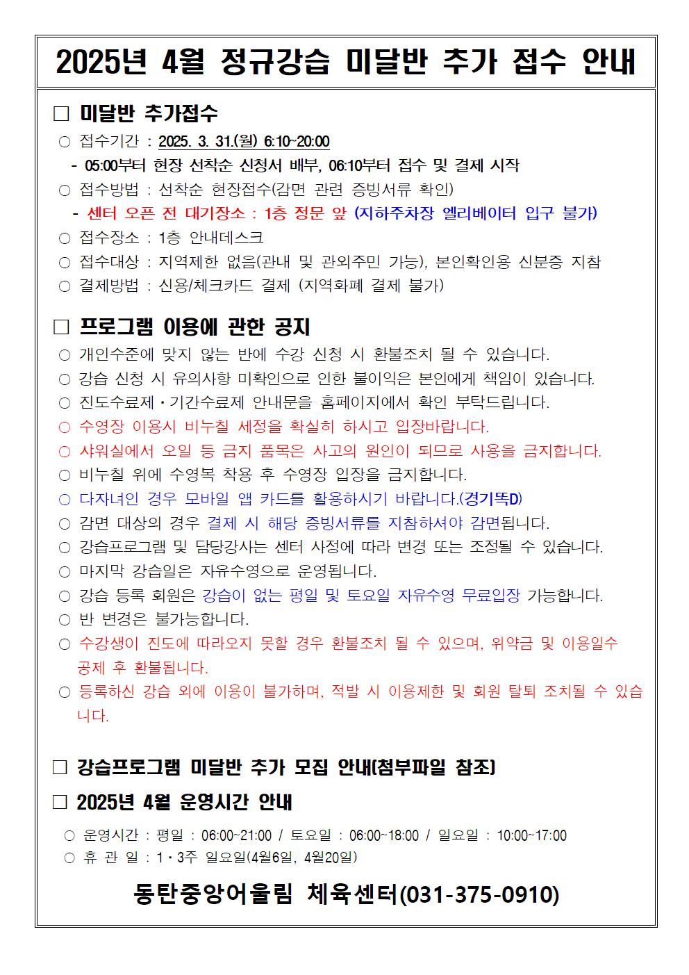 동탄중앙어울림센터 2025년 4월 정규강습 미달반 추가 모집안내 작성자 관리자 작성일 2025년 3월 28일 13시 56분 34초 조회 1,862 2025년 4월 정규강습 미달반 현황.jpg [ Size : 33.03KB, Down : 2,424 ] 미리보기 다운로드 2025년 4월 정규강습 미달반 추가 접수 안내.jpg [ Size : 221.79KB, Down : 2,292 ] 미리보기 다운로드 자세한 사항은 아래 공고문 확인바랍니다. 목록보기
