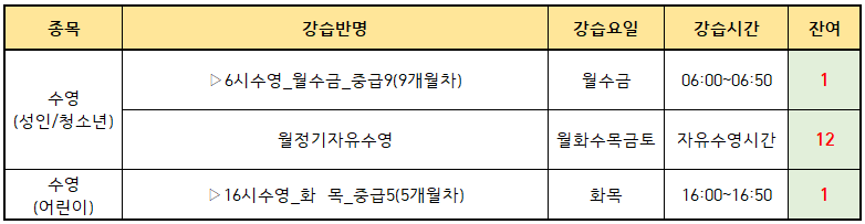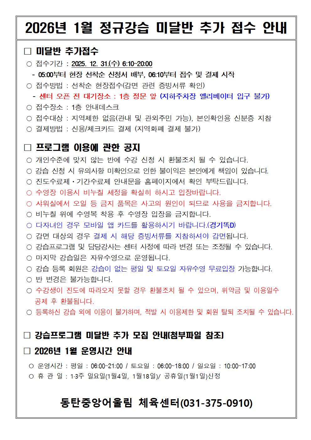 동탄중앙어울림센터 2026년 1월 정규강습 미달반 추가 모집안내 작성자 관리자 작성일 2025년 12월 30일 11시 18분 19초 조회 1,381 2026년 1월 정규강습 미달반 추가 접수 안내001.jpg [ Size : 226.23KB, Down : 1,888 ] 미리보기 다운로드 2026년 1월 미달반.png [ Size : 12.5KB, Down : 1,709 ] 미리보기 다운로드 12월 31일(수) 접수기간 마감 이후 2026년 1월 강습 추가 모집 없습니다.자세한 사항은 아래 공고문 확인바랍니다. 목록보기