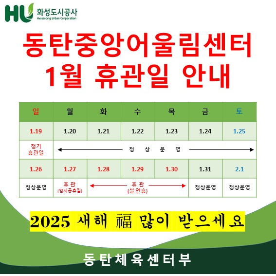 동탄중앙어울림센터 2025년 1월 휴관일 안내(수정) 작성자 관리자 작성일 2025년 1월 15일 15시 2분 20초 조회 1,029 25년1월 휴관일안내 1.JPG [ Size : 75.07KB, Down : 1,111 ] 미리보기 다운로드 안녕하세요. 동탄중앙어울림센터입니다.1월27일(월)이 임시공휴일로 지정됨에 따라 휴관합니다.이용에 착오 없으시길 바랍니다. 감사합니다. 목록보기