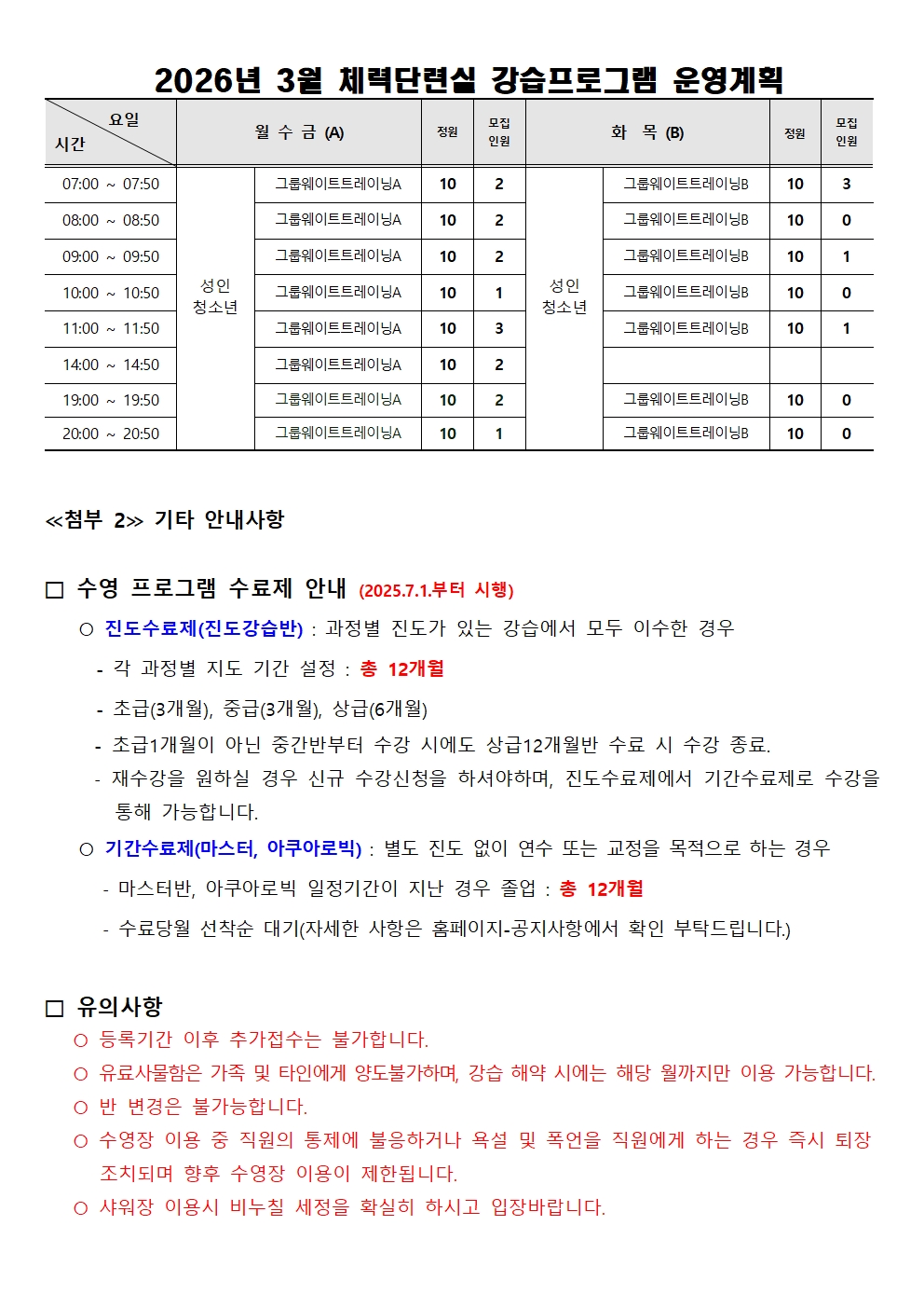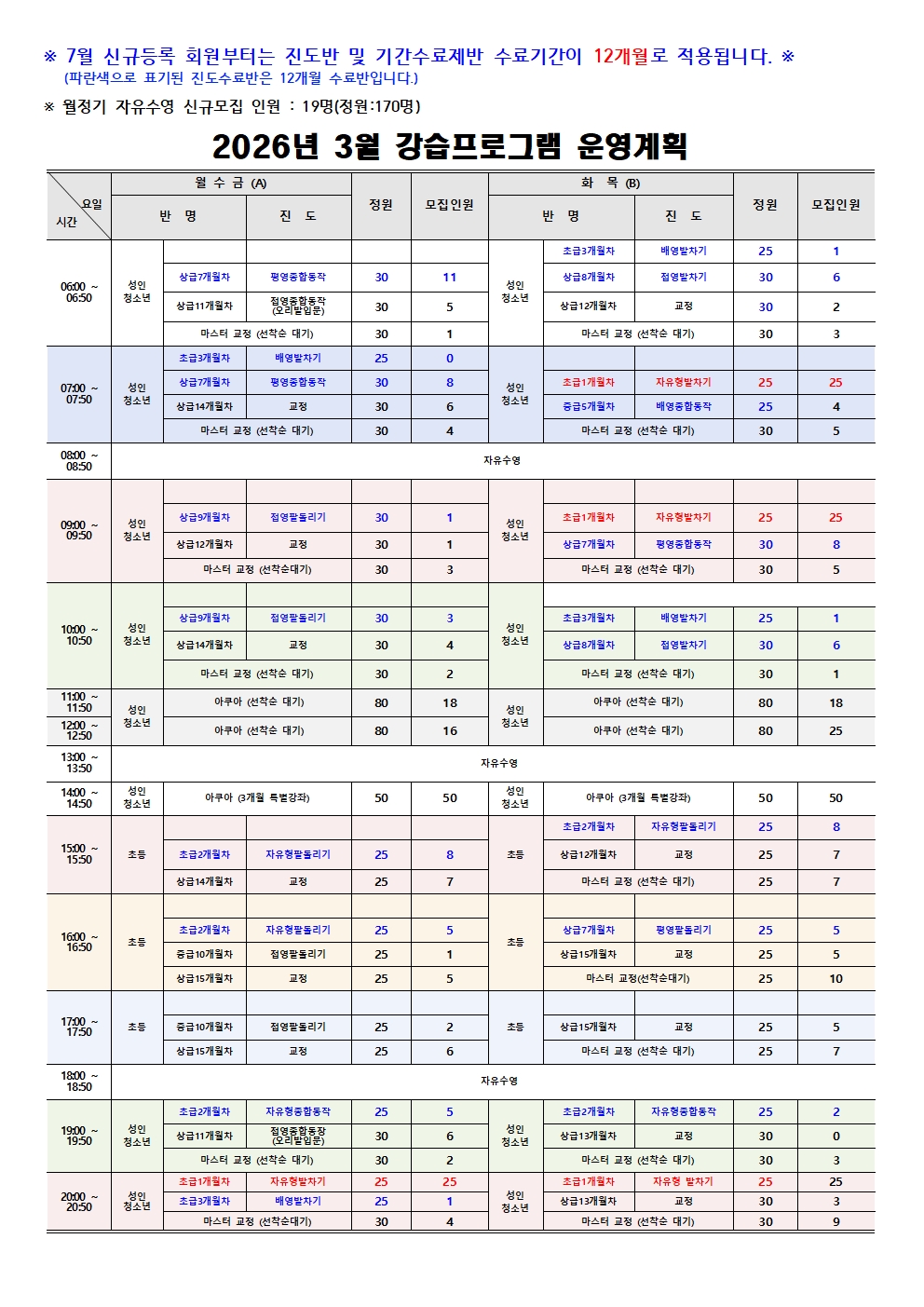 동탄중앙어울림센터 2026년 3월 정규강습 신규회원 모집 안내 작성자 관리자 작성일 2026년 2월 20일 15시 9분 59초 조회 3,226 2026년 3월 강습 신규회원 등록 안내문001.jpg [ Size : 707.55KB, Down : 6,038 ] 미리보기 다운로드 2026년 3월 강습 신규회원 등록 안내문002.jpg [ Size : 665.12KB, Down : 6,663 ] 미리보기 다운로드 2026년 3월 강습 신규회원 등록 안내문003.jpg [ Size : 601.03KB, Down : 5,675 ] 미리보기 다운로드 2026년 3월 강습 신규회원 등록 안내문004.jpg [ Size : 308.37KB, Down : 5,516 ] 미리보기 다운로드 목록보기