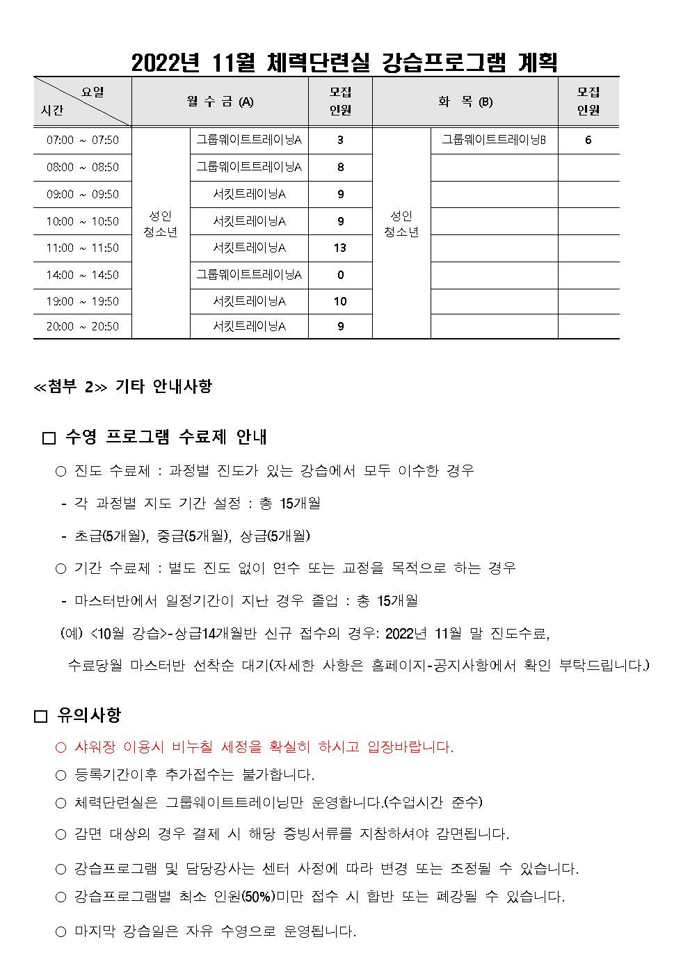 동탄중앙어울림센터 2022년 11월 정규강습 신규회원 모집 안내 작성자 관리자 작성일 2022년 10월 21일 13시 56분 39초 조회 2,720 2022년 11월 강습 신규회원 등록 안내문003.jpg [ Size : 164.54KB, Down : 937 ] 미리보기 다운로드 2022년 11월 강습 신규회원 등록 안내문002.jpg [ Size : 280.96KB, Down : 5,007 ] 미리보기 다운로드 2022년 11월 강습 신규회원 등록 안내문.pdf [ Size : 113.07KB, Down : 951 ] 다운로드 2022년 11월 강습 신규회원 등록 안내문001.jpg [ Size : 204.32KB, Down : 4,556 ] 미리보기 다운로드 목록보기