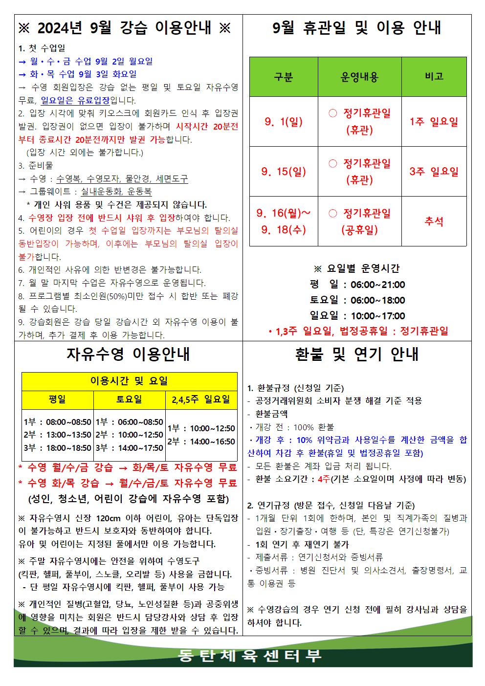 동탄중앙어울림센터 2024년 9월 휴관일 및 이용안내 작성자 관리자 작성일 2024년 8월 19일 6시 55분 4초 조회 1,164 2024년 9월 강습이용안내.jpg [ Size : 286.05KB, Down : 1,404 ] 미리보기 다운로드 목록보기