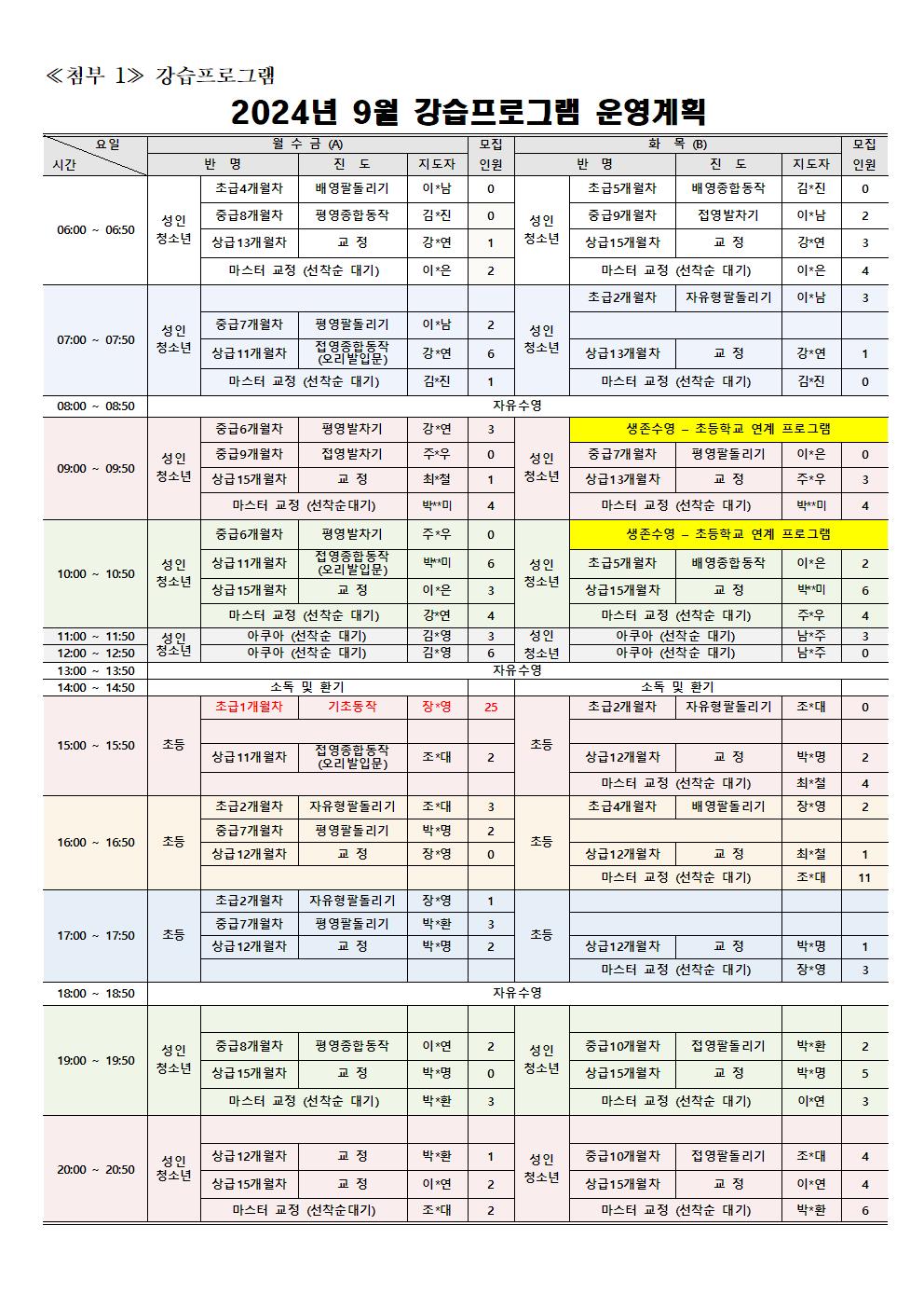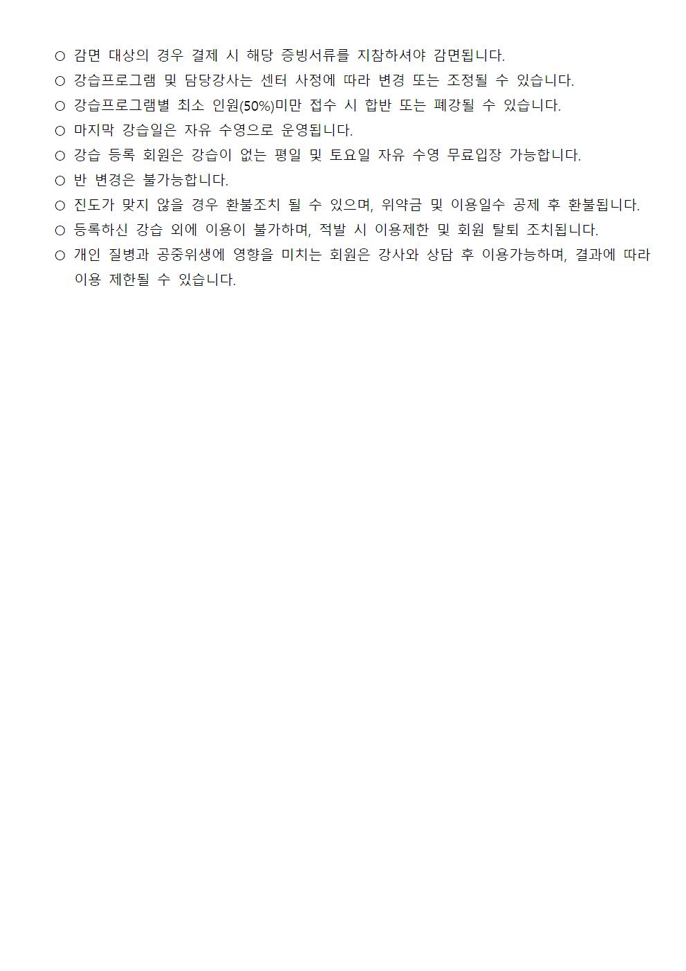 동탄중앙어울림센터 2024년 9월 정규강습 신규회원 모집 안내 작성자 관리자 작성일 2024년 8월 16일 14시 58분 40초 조회 3,787 2024년 9월 강습 신규회원 등록 안내문1.jpg [ Size : 207.55KB, Down : 504 ] 미리보기 다운로드 2024년 9월 강습 신규회원 등록 안내문2.jpg [ Size : 263.93KB, Down : 536 ] 미리보기 다운로드 2024년 9월 강습 신규회원 등록 안내문3.jpg [ Size : 174.61KB, Down : 493 ] 미리보기 다운로드 2024년 9월 강습 신규회원 등록 안내문4.jpg [ Size : 83.77KB, Down : 487 ] 미리보기 다운로드 강습은 종목별 1인 1강좌 접수 가능유의사항 필독 목록보기