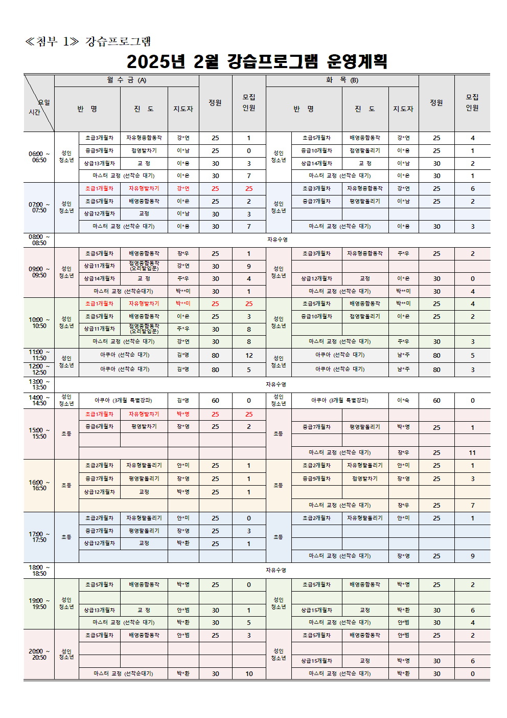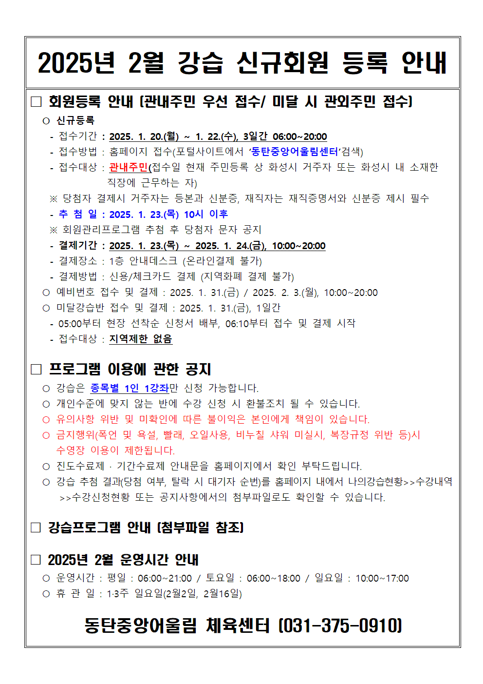 동탄중앙어울림센터 2025년 2월 정규강습 신규회원 모집 안내