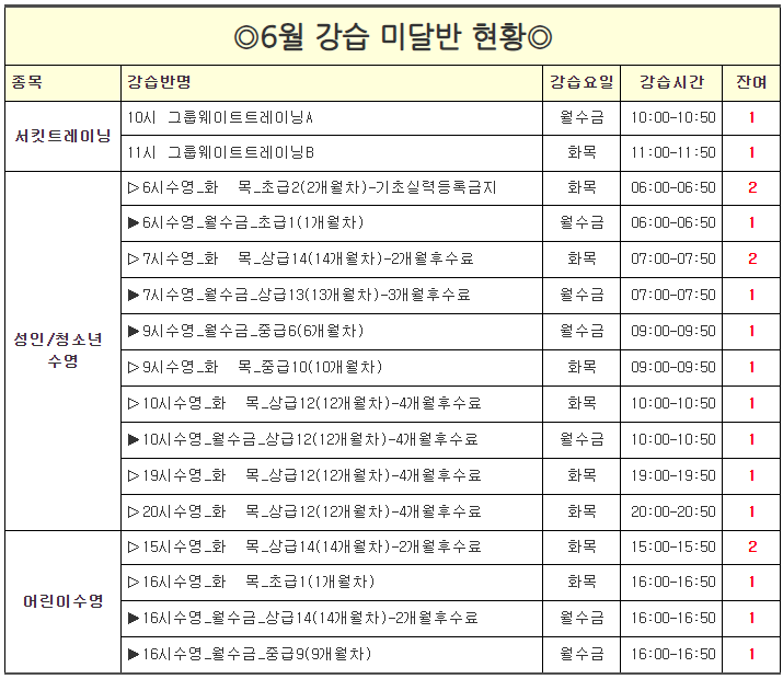 | 종목 | 강습반명 | 강습요일 | 강습시간 | 잔여 |