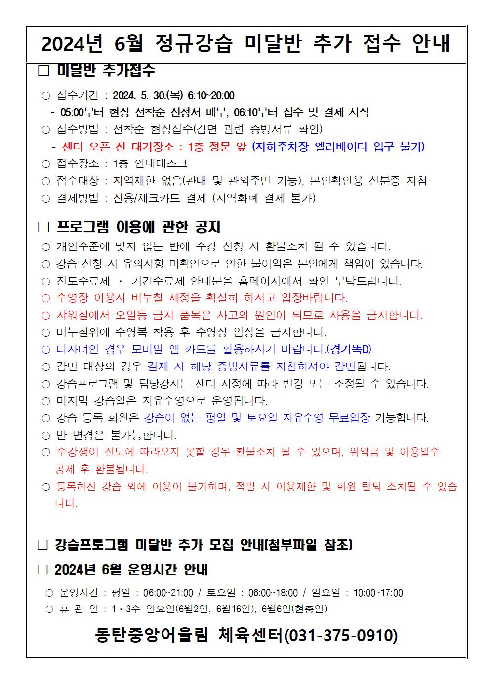 동탄중앙어울림센터 2024년 6월 정규강습 미달반 추가 모집안내(마감)