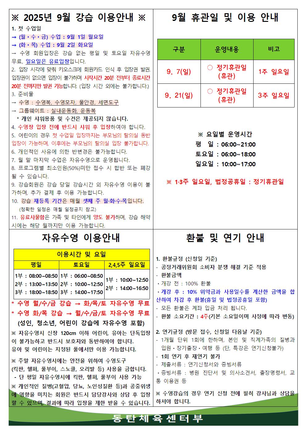동탄중앙어울림센터 2025년 9월 휴관일 및 이용안내 작성자 관리자 작성일 2025년 8월 21일 13시 28분 7초 조회 576 2025년 9월 휴관일 및 이용안내.jpg [ Size : 288.93KB, Down : 723 ] 미리보기 다운로드 목록보기