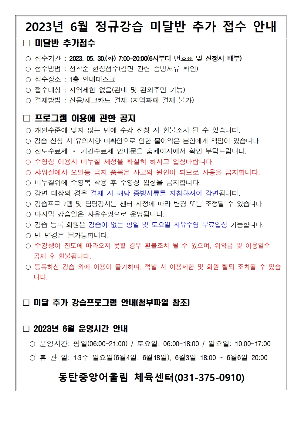 동탄중앙어울림센터 2023년 6월 정규강습 미달반 모집 안내 작성자 관리자 작성일 2023년 5월 26일 13시 10분 21초 조회 2,158 image001.jpg [ Size : 690.28KB, Down : 3,118 ] 미리보기 다운로드 6월 정규강습 미달반 모집인원.xlsx [ Size : 11.71KB, Down : 2,056 ] 다운로드 목록보기