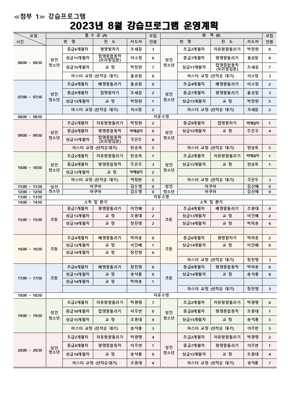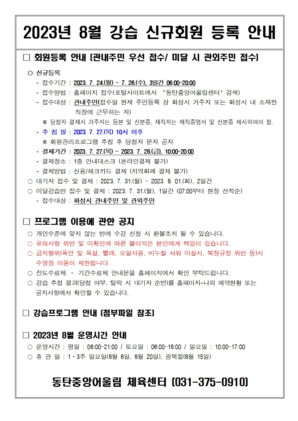 동탄중앙어울림센터 2023년 8월 정규강습 신규회원 모집 안내 작성자 관리자 작성일 2023년 7월 21일 13시 17분 41초 조회 3,448 2023년 8월 강습 신규회원 등록 안내문.pdf [ Size : 120.68KB, Down : 1,171 ] 다운로드 image002.jpg [ Size : 833.57KB, Down : 6,050 ] 미리보기 다운로드 image003.jpg [ Size : 554.95KB, Down : 5,550 ] 미리보기 다운로드 image001.jpg [ Size : 668.4KB, Down : 3,542 ] 미리보기 다운로드 1인 1강좌만 신청 가능추첨일 : 07.27.(목) 10시 이후 (선착순 X) 목록보기