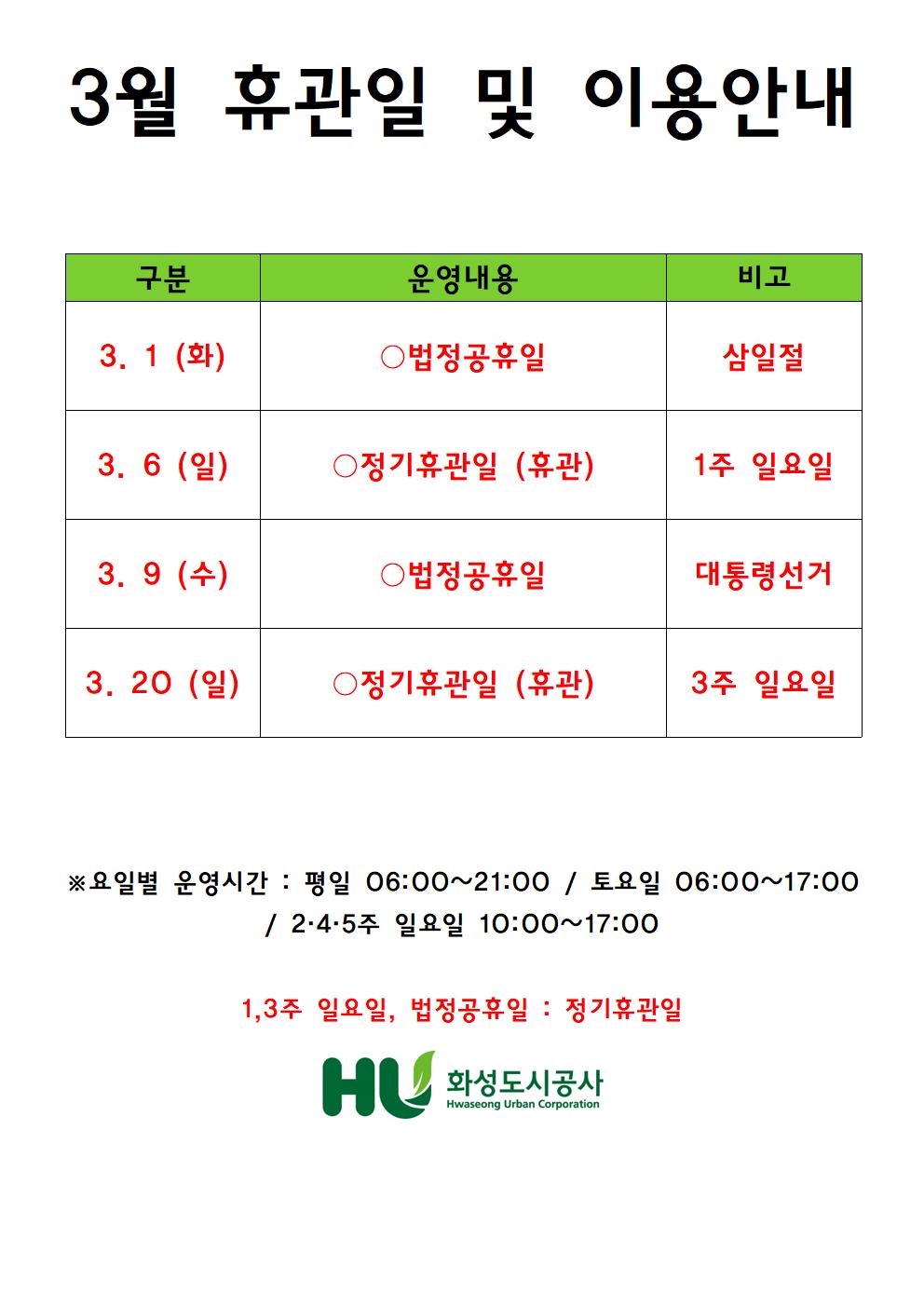 동탄중앙어울림센터 2022년 3월 휴관일 및 이용안내 작성자 관리자 작성일 2022년 2월 28일 8시 58분 53초 조회 895 2022년 3월 휴관일 및 이용안내001.jpg [ Size : 106.72KB, Down : 948 ] 미리보기 다운로드 목록보기