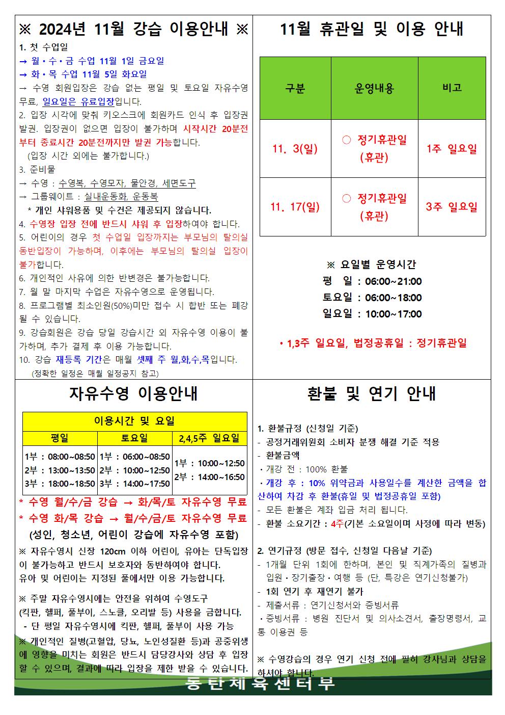 동탄중앙어울림센터 2024년 11월 휴관일 및 이용안내 작성자 관리자 작성일 2024년 10월 25일 6시 16분 17초 조회 934 2024년 11월 휴관일 및 이용안내.jpg [ Size : 281.84KB, Down : 1,098 ] 미리보기 다운로드 목록보기
