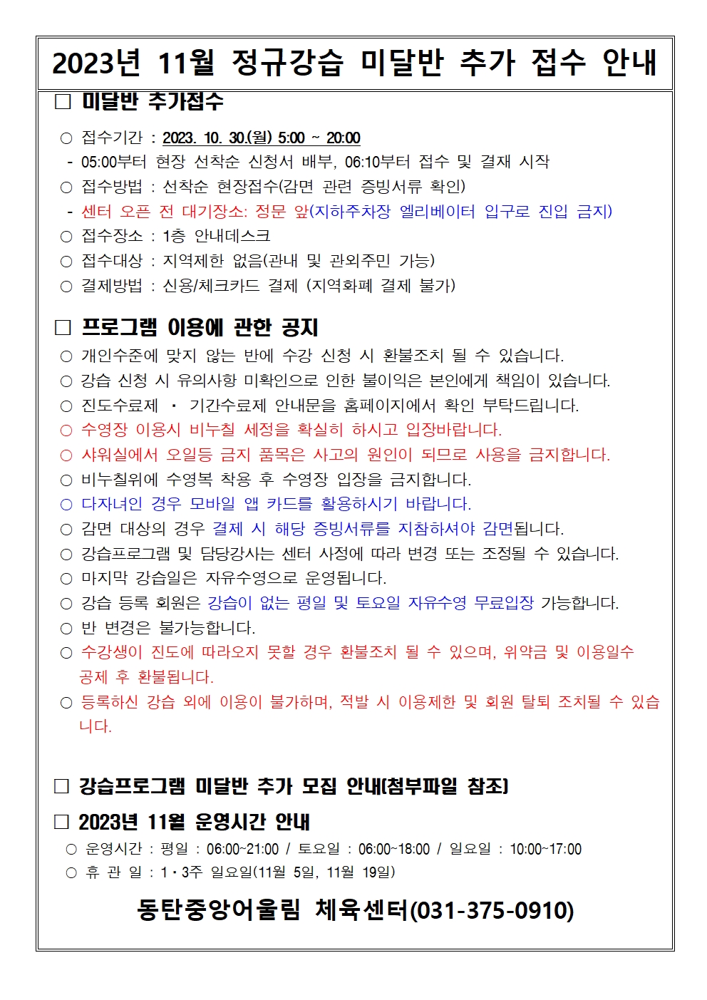 동탄중앙어울림센터 2023년 11월 정규강습 미달반 모집 안내 작성자 관리자 작성일 2023년 10월 27일 14시 24분 44초 조회 1,617 미달반001.jpg [ Size : 734.78KB, Down : 2,799 ] 미리보기 다운로드 2023년 11월 정규강습 미달반 추가 접수 안내.pdf [ Size : 56.31KB, Down : 811 ] 다운로드 11월 정규강습 미달반 현황.xlsx [ Size : 11.31KB, Down : 1,680 ] 다운로드 목록보기