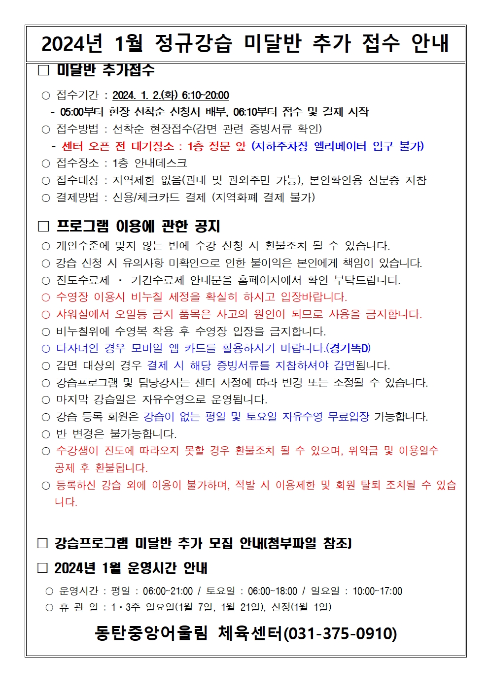 동탄중앙어울림센터 24년 1월 정규강습 미달반 추가 모집 안내 작성자 관리자 작성일 2023년 12월 29일 15시 56분 4초 조회 1,961 24년 1월 미달반 공고문001.jpg [ Size : 751.18KB, Down : 2,383 ] 미리보기 다운로드 24년 1월 미달반 리스트.xlsx [ Size : 10.24KB, Down : 713 ] 다운로드 목록보기