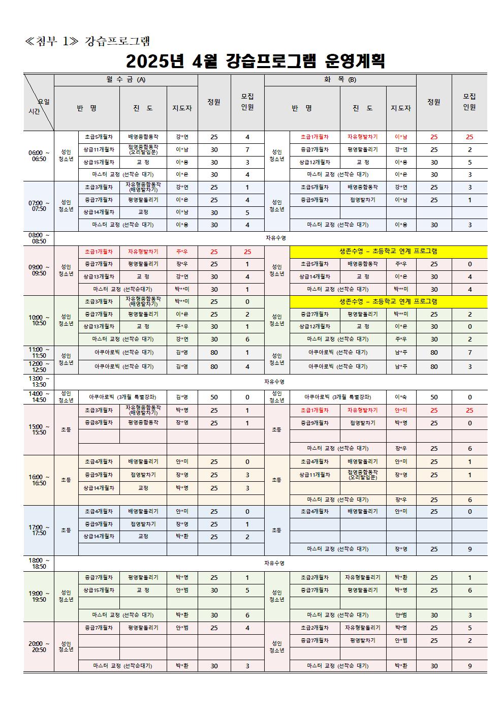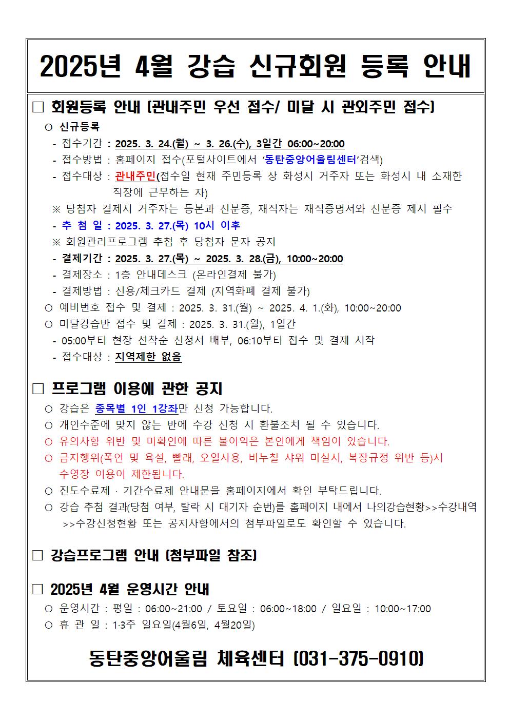 동탄중앙어울림센터 2025년 4월 정규강습 신규회원 모집 안내