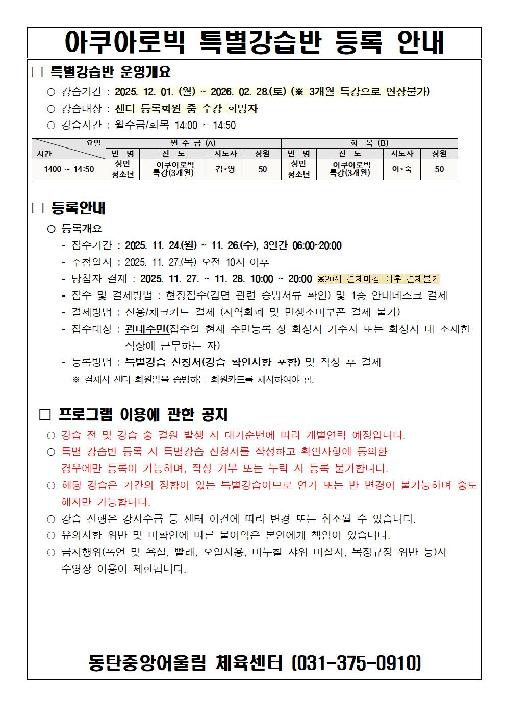 동탄중앙어울림센터 2025년 12월 아쿠아로빅 특별강습반 등록 안내 작성자 관리자 작성일 2025년 11월 21일 14시 16분 48초 조회 768 2025년 12월 아쿠아로빅 특별강습반 등록 안내문 등001.jpg [ Size : 204.79KB, Down : 1,026 ] 미리보기 다운로드 2025년 12월 아쿠아로빅 특별강습반 등록 안내문 등002.jpg [ Size : 118.14KB, Down : 949 ] 미리보기 다운로드 목록보기