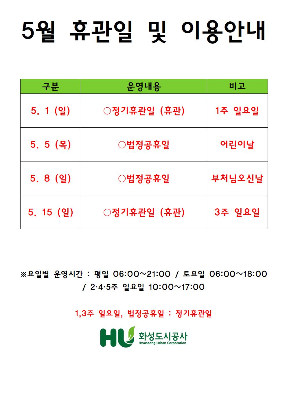 동탄중앙어울림센터 2022년 5월 휴관일 및 이용안내 작성자 관리자 작성일 2022년 5월 9일 11시 15분 24초 조회 900 2022년 5월 휴관일 및 이용안내001.jpg [ Size : 107.19KB, Down : 303 ] 미리보기 다운로드 목록보기