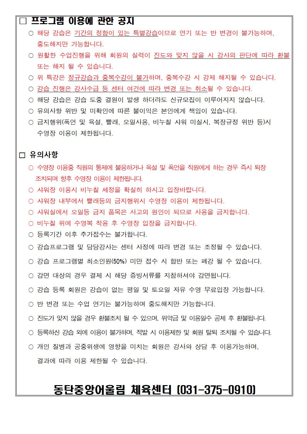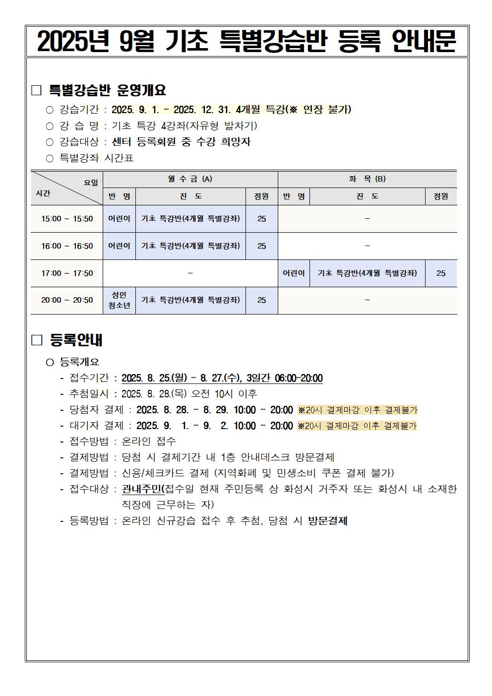동탄중앙어울림센터 2025년 9월 기초 특별강습반 등록 안내 작성자 관리자 작성일 2025년 8월 25일 7시 20분 28초 조회 2,176 2025년 9월 기초 특별강습반 등록 안내문001.jpg [ Size : 156.92KB, Down : 3,146 ] 미리보기 다운로드 2025년 9월 기초 특별강습반 등록 안내문002.jpg [ Size : 206.11KB, Down : 2,930 ] 미리보기 다운로드 목록보기