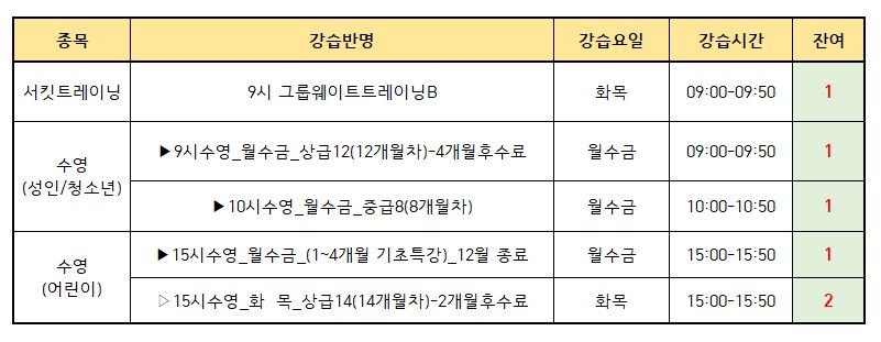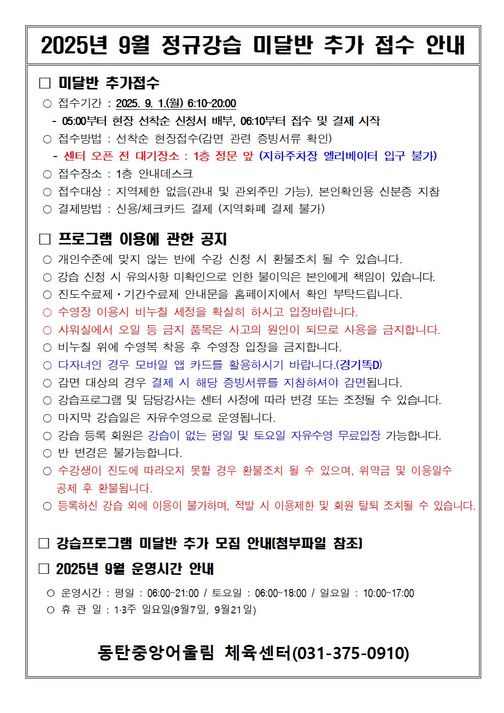 동탄중앙어울림센터 2025년 9월 정규강습 미달반 추가 모집안내 작성자 관리자 작성일 2025년 8월 29일 13시 10분 42초 조회 1,860 2025년 9월 정규강습 미달반 현황.JPG [ Size : 52.77KB, Down : 2,638 ] 미리보기 다운로드 2025년 9월 정규강습 미달반 추가 접수 안내.jpg [ Size : 224.14KB, Down : 2,431 ] 미리보기 다운로드 9월1일(월) 접수기간 마감 이후 2025년 9월 강습 추가 모집 없습니다.자세한 사항은 아래 공고문 확인바랍니다. 목록보기