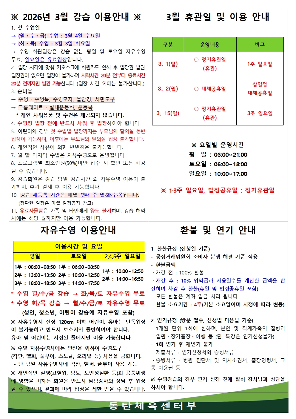 동탄중앙어울림센터 2026년 3월 휴관일 및 이용안내 작성자 관리자 작성일 2026년 2월 23일 14시 15분 10초 조회 959 2026년 3월 휴관일 및 이용안내(배포용)_001.jpg [ Size : 977.03KB, Down : 1,371 ] 미리보기 다운로드 목록보기