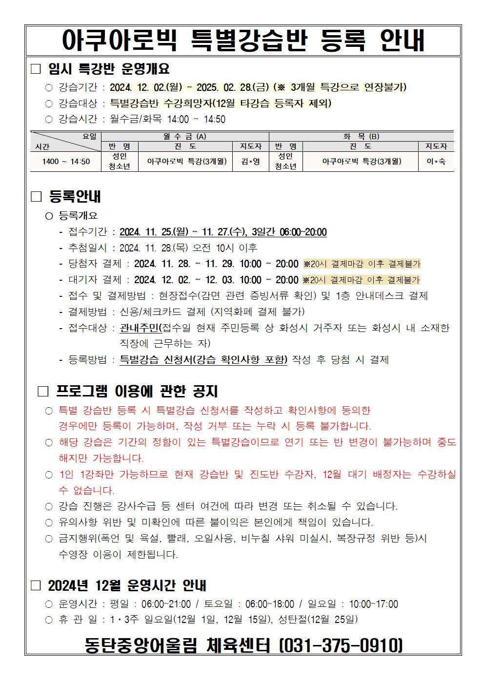 동탄중앙어울림센터 2024년 아쿠아로빅 특별강습반 등록 안내 작성자 관리자 작성일 2024년 11월 22일 15시 58분 25초 조회 1,044 2024년 12월 아쿠아로빅 특별강습반 등록 안내1.jpg [ Size : 223.78KB, Down : 1,473 ] 미리보기 다운로드 2024년 12월 아쿠아로빅 특별강습반 등록 안내2.jpg [ Size : 115.5KB, Down : 1,360 ] 미리보기 다운로드 목록보기