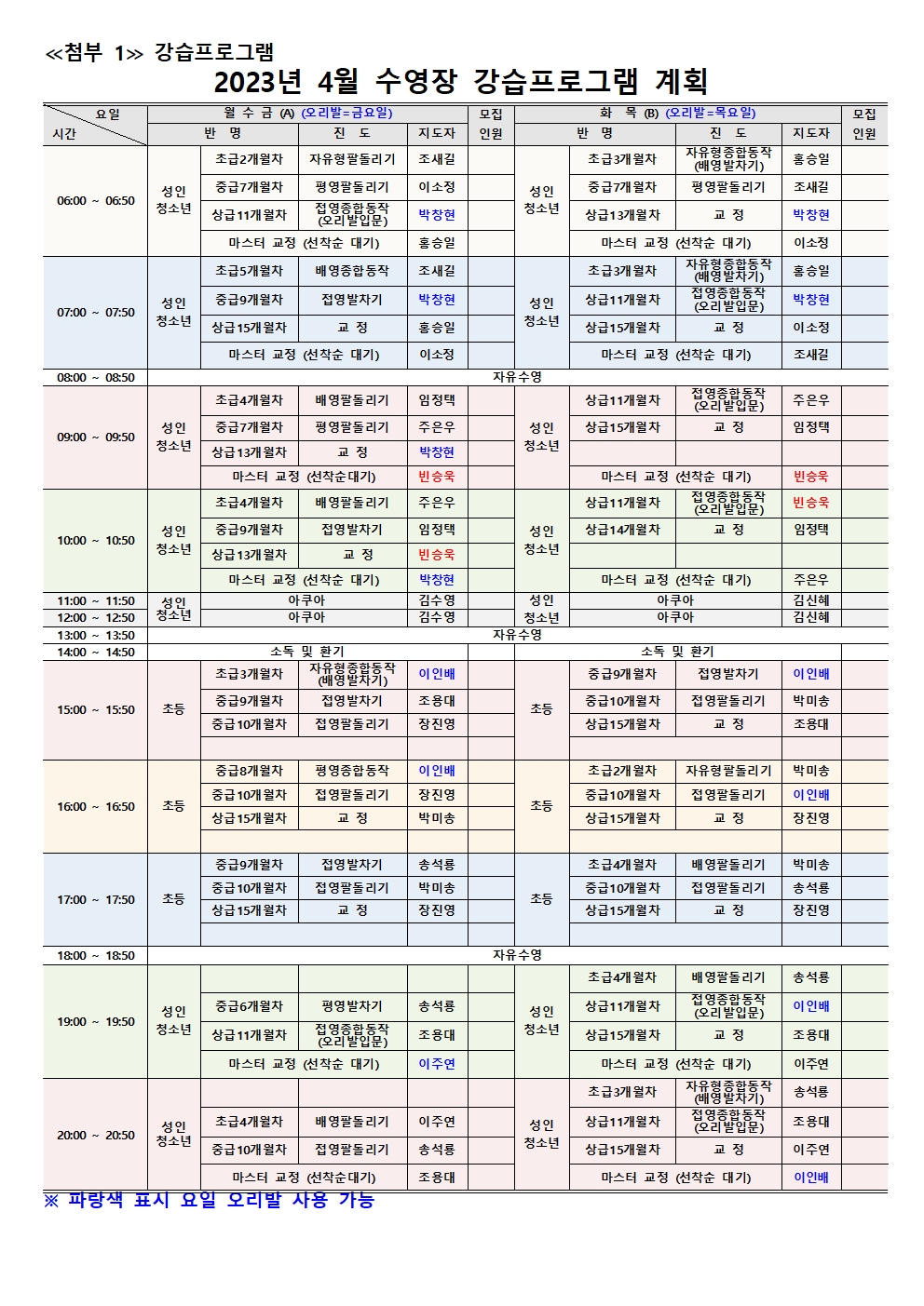 동탄중앙어울림센터 2023년 4월 정규강습 진도표 작성자 관리자 작성일 2023년 4월 14일 11시 4분 42초 조회 1,185 4월 정규강습 진도표001.jpg [ Size : 834.65KB, Down : 1,494 ] 미리보기 다운로드 목록보기