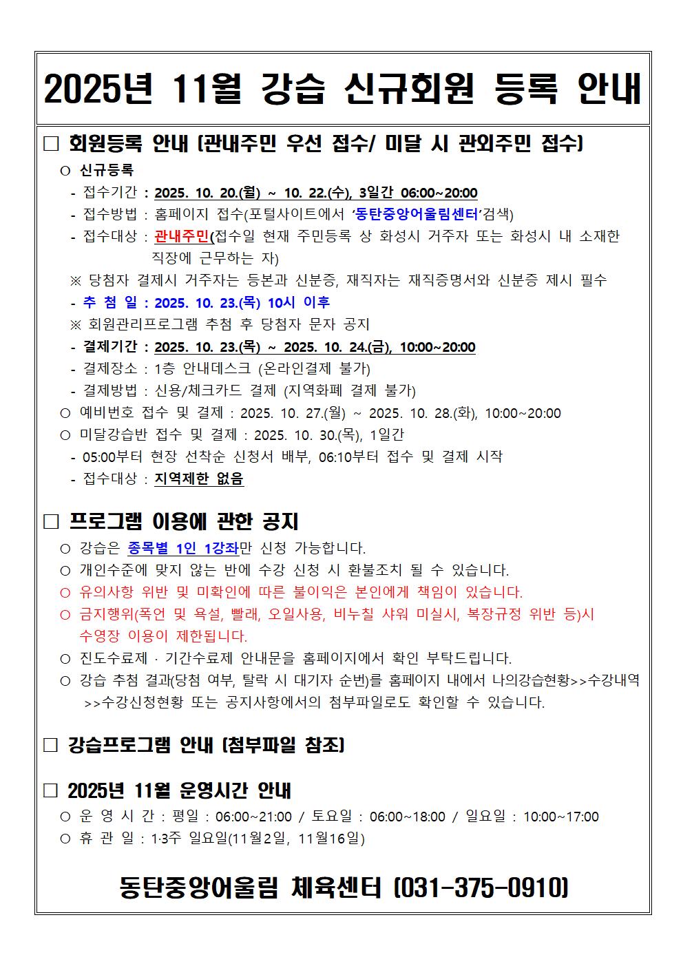 동탄중앙어울림센터 2025년 11월 정규강습 신규회원 모집 안내