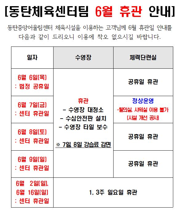 수영장 저수조 청소 및 수심조절판 설치로 인하여 6월 7일(금), 8일(토) 센터 휴관이오니 이용에 참고하시기 바랍니다.