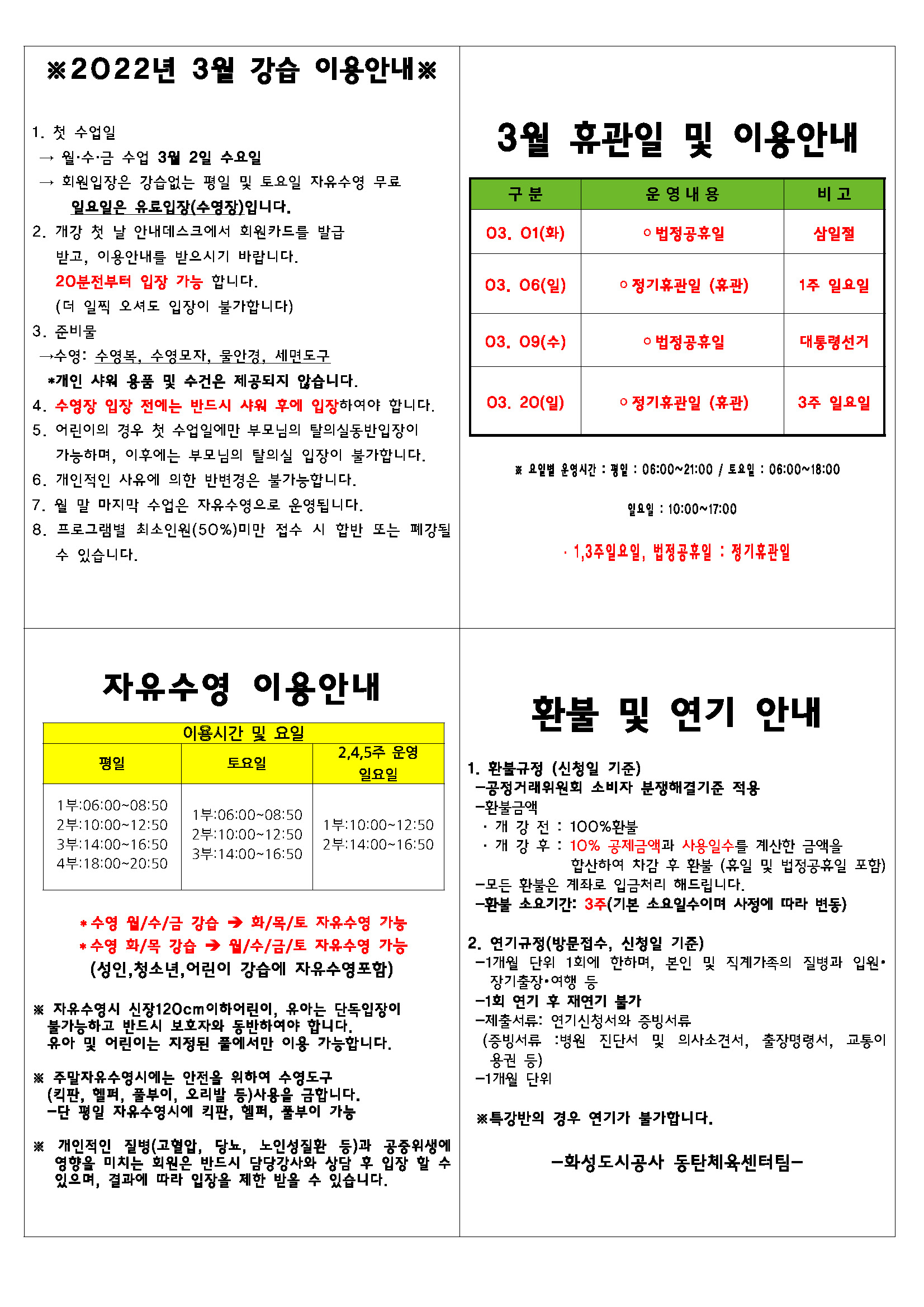 동탄중앙어울림센터 3월 특강반 이용안내 작성자 관리자 작성일 2022년 3월 4일 9시 44분 18초 조회 1,355 3월 강습이용 안내.jpg [ Size : 782.7KB, Down : 368 ] 미리보기 다운로드 목록보기