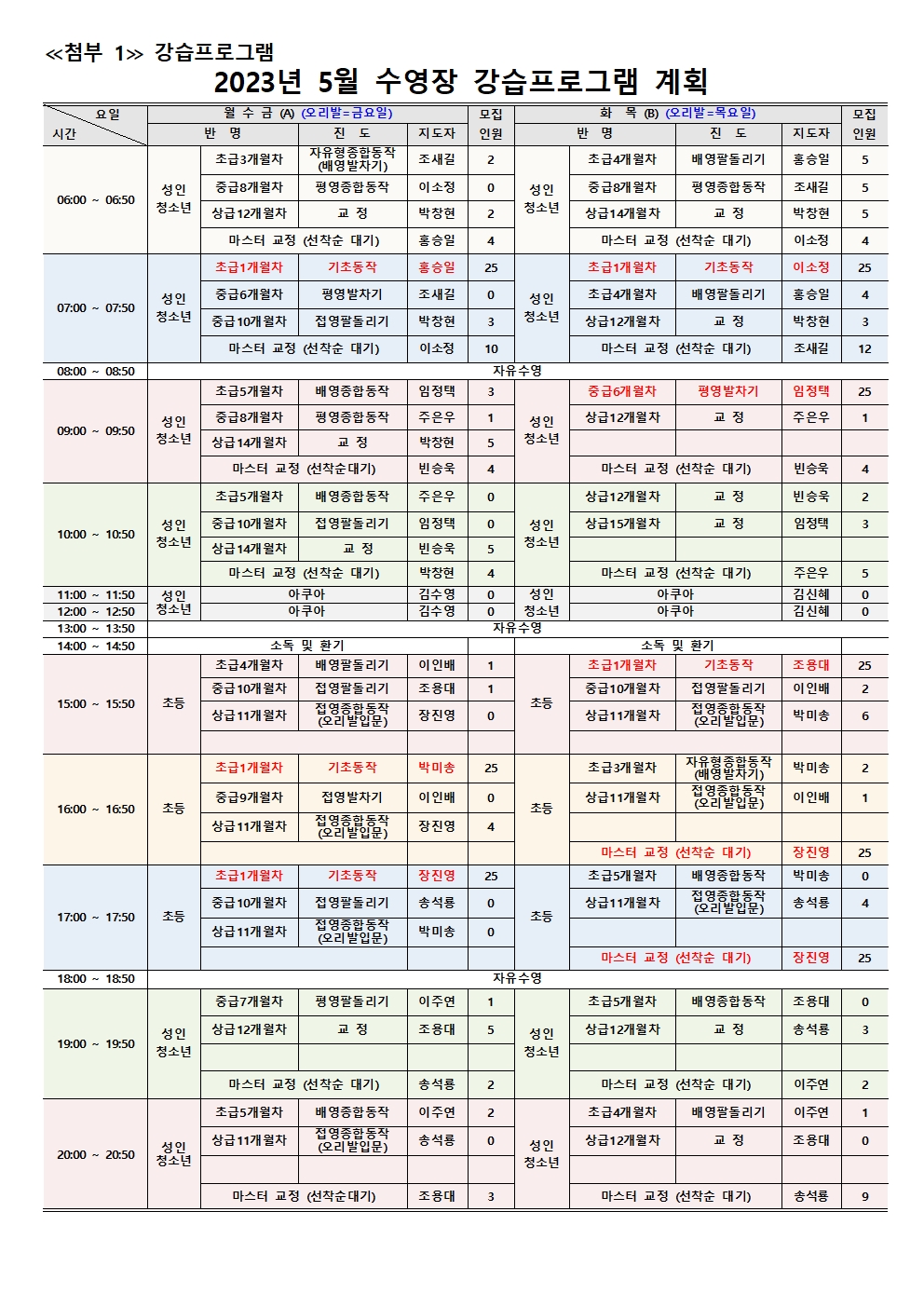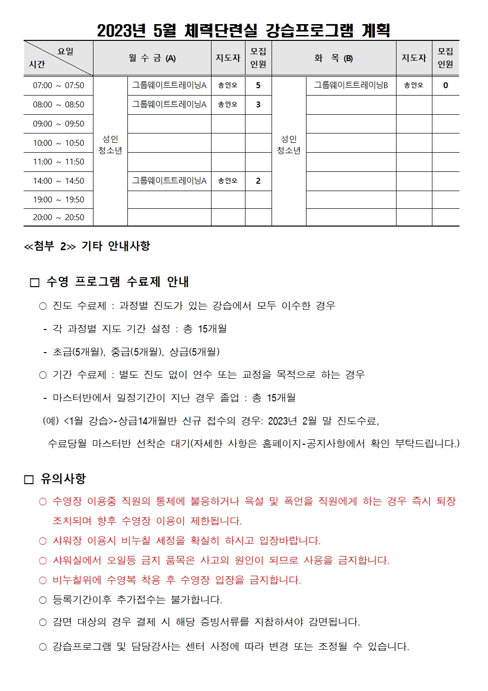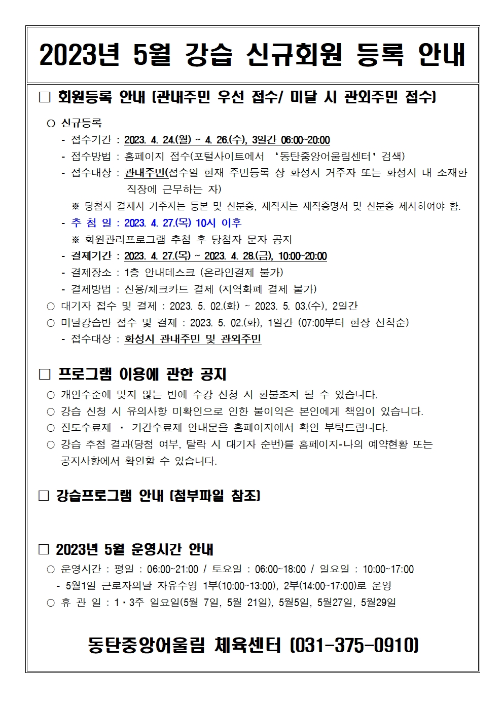 동탄중앙어울림센터 2023년 5월 정규강습 신규회원 모집 안내 작성자 관리자 작성일 2023년 4월 21일 11시 3분 2초 조회 3,868 image001.jpg [ Size : 661.72KB, Down : 6,927 ] 미리보기 다운로드 image002.jpg [ Size : 844.03KB, Down : 7,267 ] 미리보기 다운로드 image003.jpg [ Size : 523KB, Down : 6,717 ] 미리보기 다운로드 2023년 5월 강습 신규회원 등록 안내문.hwp [ Size : 94.5KB, Down : 846 ] 다운로드 1인1강좌만 신청가능합니다. 목록보기